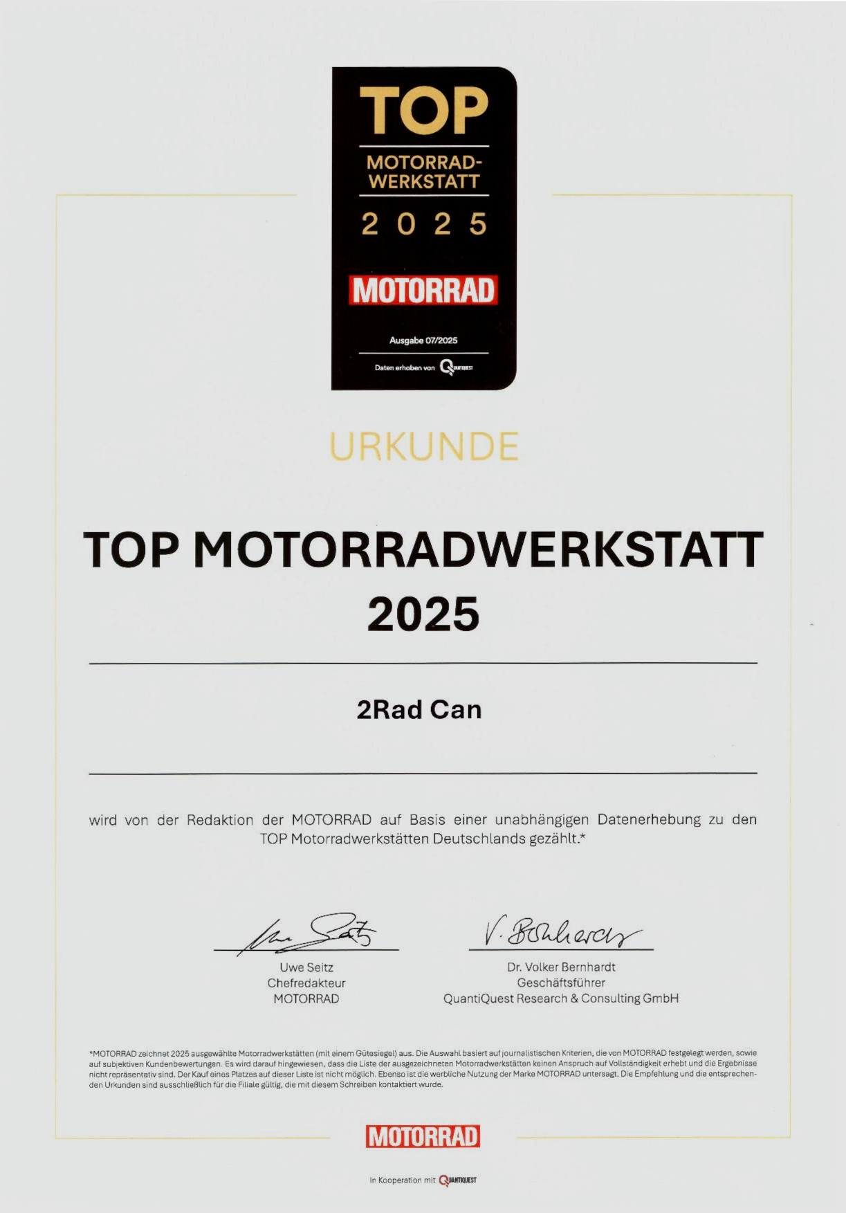 Es ist eine große Ehre, dass 2Rad Can von der renommierten Fachzeitschrift MOTORRAD als Top Motorradwerkstatt 2025 ausgezeichnet wurde. Diese Anerkennung basiert auf herausragendem Service, Fachkompetenz und Vertrauen in die Arbeit von 2Rad Can. Ein herzliches Dankeschön an alle Kundinnen und Kunden für das Vertrauen – auch in Zukunft steht bester Service rund ums Bike an erster Stelle!